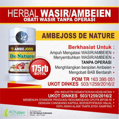 Ambejoss adalah produk unggulan De Nature Indonesia, Ambejoss resmi terdaftar di BPOM dengan POM. TR 163 395 051. Tiap kapsul Ambejoss mengandung Graptophilly folium, Phaleria macrocarpa pericarpum, Curcuma mangga rhizoma. Daun ungu termasuk tanaman herbal yang memiliki banyak manfaat terutama dalan bidang kesehatan. Diantara khasiat Daun Ungu untuk mengatasi penyakit wasir dan mengObat Herbal sembelit.Daftar Harga Obat Ambeien Ambejoss Asli De NatureJika penyakit wasir/ambeien masih dalam tingkatan stadium ringan, dengan ciri belum ada benjolan di anus cukup menggunakan kapsul ambejoss saja.